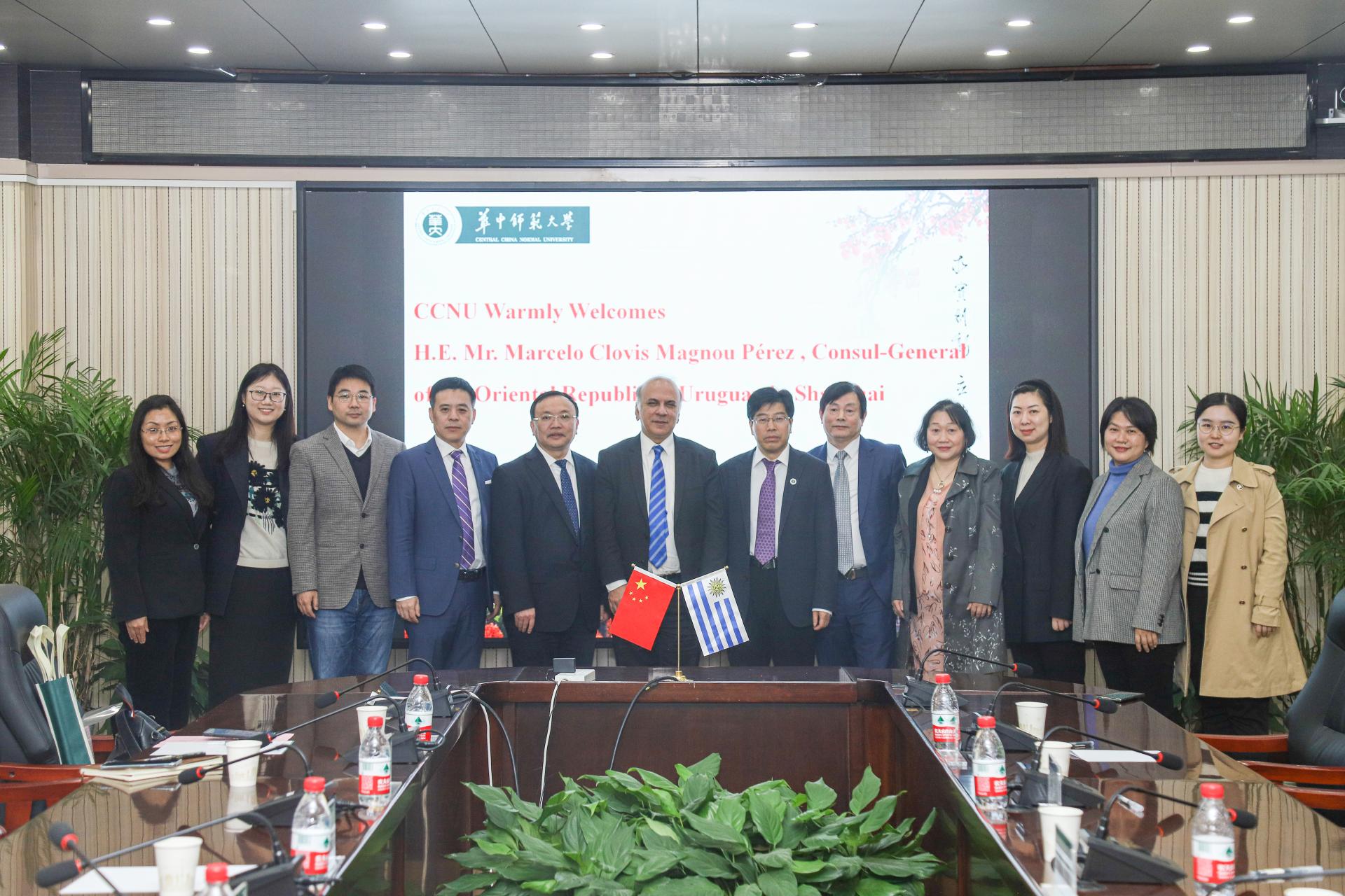 华大在线讯(通讯员 王盛夏)3月28日,乌拉圭驻上海总领事马塞罗·马龙来访,湖北省委外事工作办公室美大处处长代平等陪同。校党委书记夏立新、副校长彭双阶会见了总领事一行,国际合作与交流处、外国语学院等相关单位负责人参加座谈。