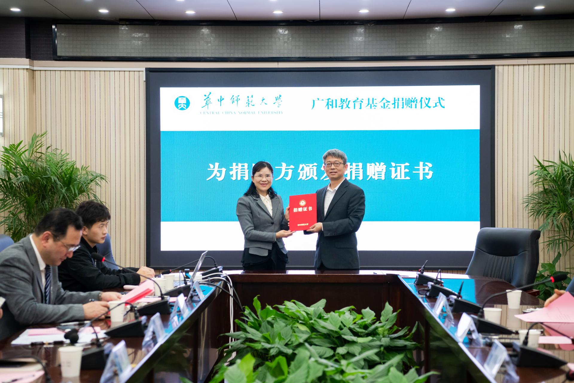 华大在线讯(通讯员 吴国栋 徐静宜)4月3日,广和教育基金捐赠仪式在行政楼一楼会议室举行。校党委书记夏立新、广东广和律师事务所首席合伙人童新出席,学校教育发展基金会、法学院和广和律师事务所相关负责同志以及师生代表参加。