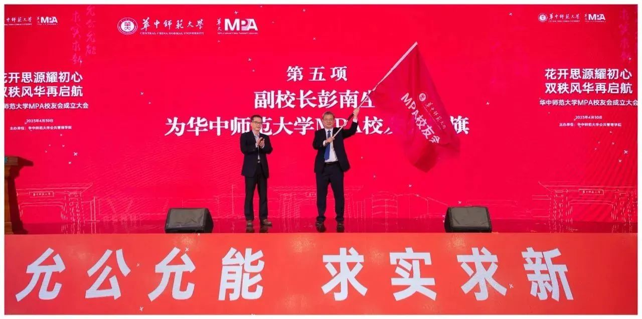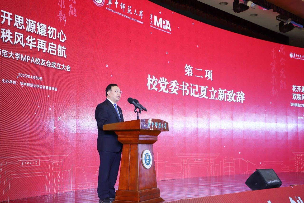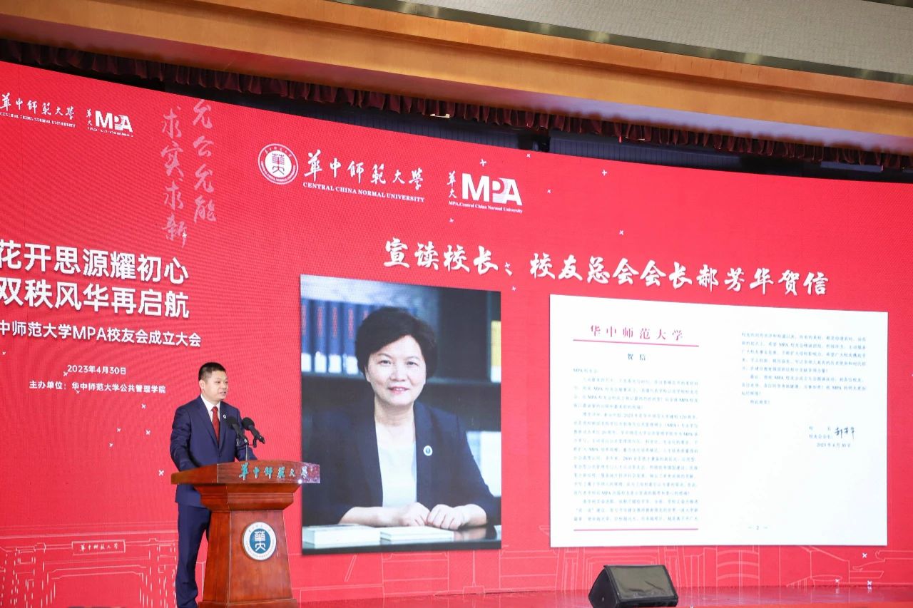校友总会秘书长郭庆代表校友总会赠送纪念品,宣读校长、校友总会会长郝芳华贺信。贺信中,郝芳华向MPA校友会的成立表示祝贺,希望MPA校友会精诚团结、积极作为,主动服务广大校友事业发展;希望广大校友牢记华师人肩负的历史使命和时代担当,在建设教育强国新征程中贡献华师力量。