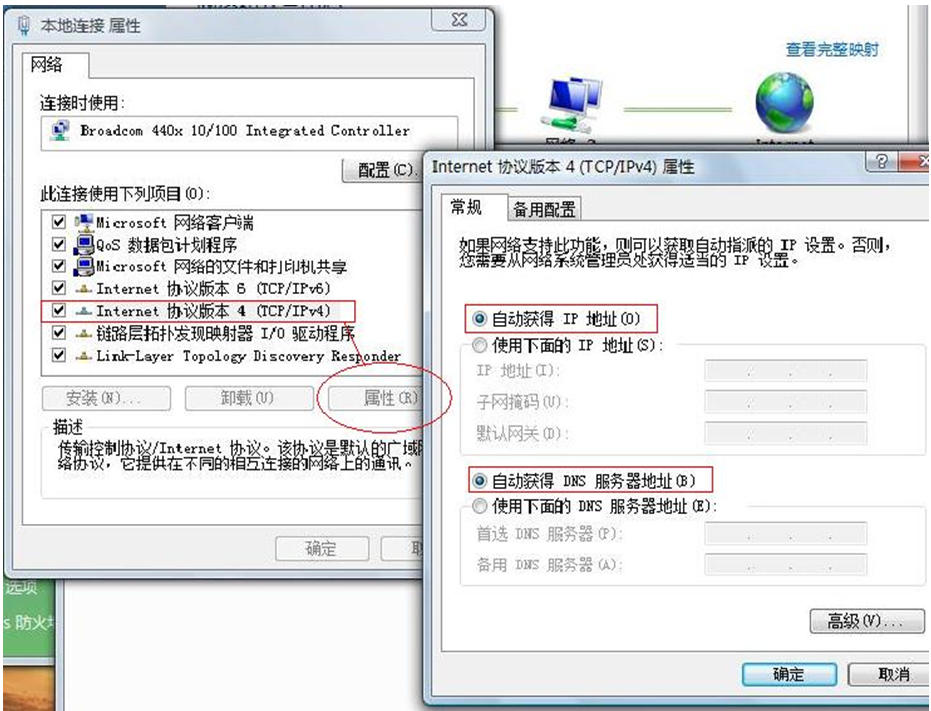 在控制面板的网络设置选项下,找到“本地连接”的“Internet协议版本4(TCP/IPv4)”,打开“属性”设置,选择“自动获得IP地址和DNS服务器地址”,如下图(图1)所示: