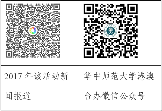 3.该活动往年有关报道可扫描下方二维码了解,也可参阅“米兰网投港澳台办”微信公众号或港澳台办网站hmt.ccnu.edu.cn。关于2018年活动详情可咨询国际处(港澳台办)汪亭亭老师、校团委陶力老师。