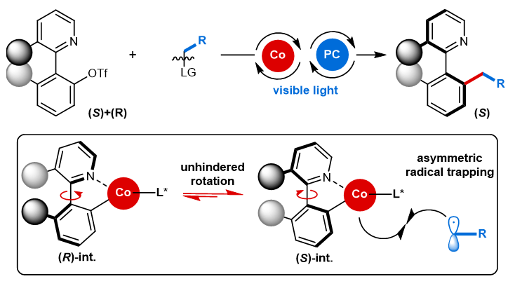 轴手性骨架是天然产物、手性药物和材料的常见结构单元,也是不对称合成中手性试剂、配体与催化剂的重要组成部分。因此,发展高效、高选择性的轴手性构建方法一直是手性科学的重要研究内容。近年来,利用可见光在温和条件下产生高活性自由基从而实现中心手性化合物的绿色、高效合成已有不少报道。然而,相关的轴手性骨架的不对称合成鲜有报道。