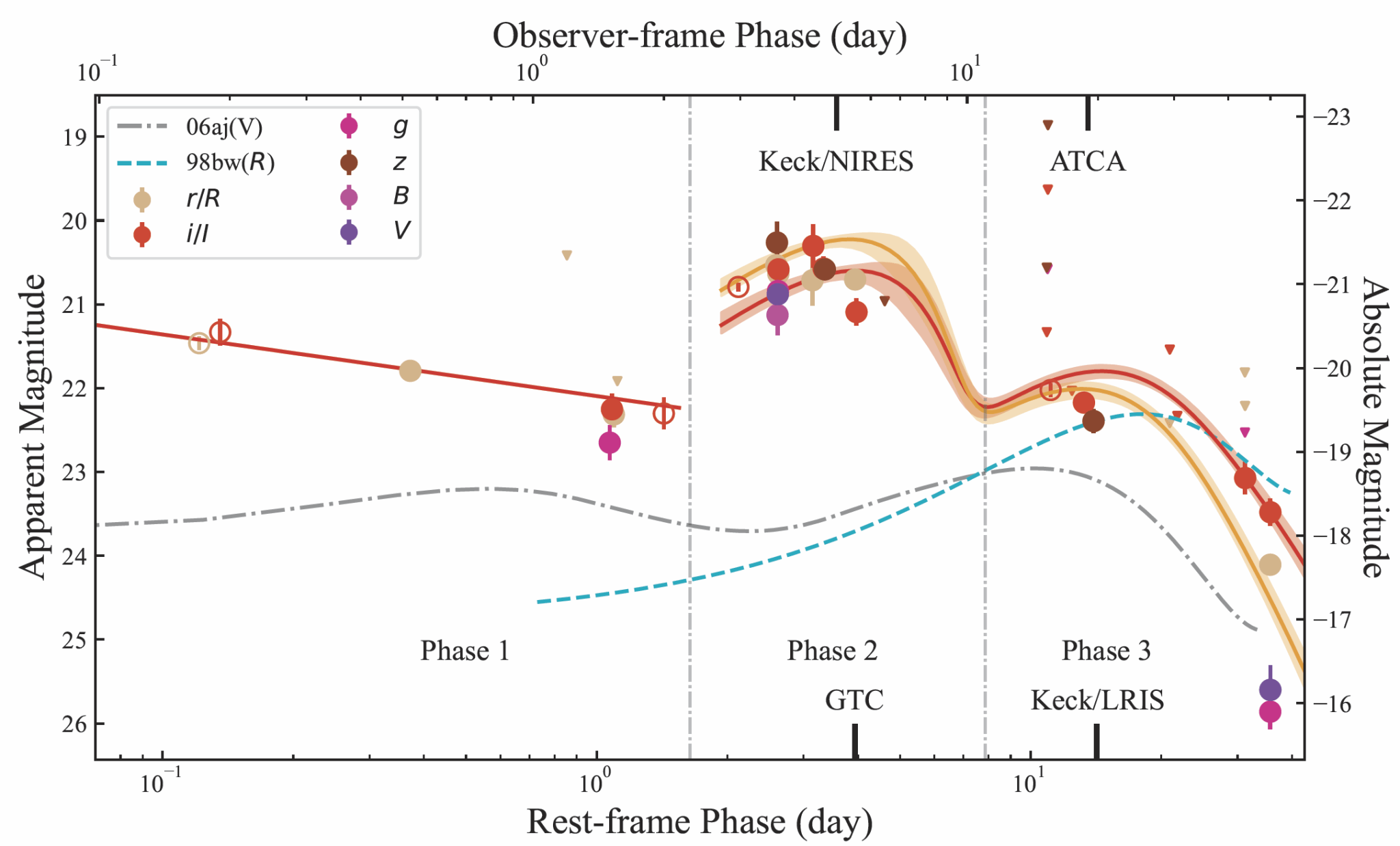 华大在线讯(通讯员 俞云伟)近日,我校物理科学与技术学院天体物理研究所青年教师刘良端副研究员以共同第一作者身份在《Nature Astronomy》合作发表了题为“A fast X-ray transient from a weak relativistic jet associated with a type Ic-BL supernova”的研究论文。该项成果由“天关”卫星(Einstein Probe,EP)科学合作组完成。该合作组由我校与中国科学院国家天文台、北京师范大学、清华大学、美国内华达大学等多家科研机构共同组成,刘良端在此项工作中负责对天文观测数据的理论解释。